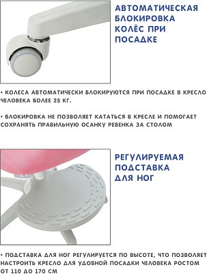 Детское кресло Holto-22 для детей от 3 лет и до подросткового возраста. Подходит для роста от 110 до 170 см. Можно использовать как с растущей партой, так и с обычной. Изменяя глубину спинки и высоту сидения, Вы подберете наиболее комфортное положение для ребенка. Колеса имеют функцию стоп-вращения при посадке в кресло человека свыше 25 кг. Малыш не будет отвлекаться от уроков, катаясь на кресле. Кресло имеет регулируемую подставку для ног, которую можно снять при необходимости.