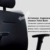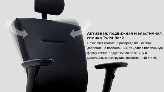 Второй особенностью в кресле является цельная эргономичная спинка Twist Back со встроенным поясничным упором, регулируемым по высоте и глубине, обеспечивающим постоянный контакт со спиной. Форма спинки обладает корсетной поддержкой и корректирует осанку пользователя.