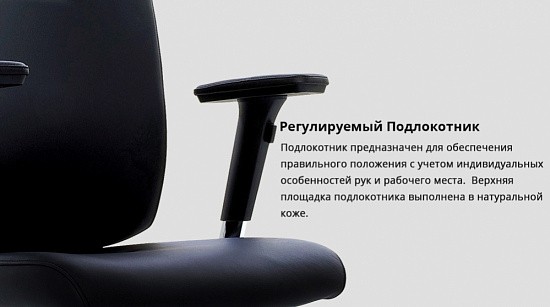 Многофункциональные подлокотники, установленные на полированные металлические основания, имеют полумягкие накладки, обитые натуральной кожей, регулируются по высоте, глубине и углу наклона в горизонтальной плоскости. Это позволяет настроить подлокотники под индивидуальные физические особенности пользователя, что значительно снижает концентрацию напряжения в плечевом поясе.
