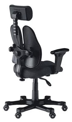 Эргономичное кресло имеет регулируемый по высоте подголовник, оснащенный возможностью смены угла наклона, систему раздвоенной спинки BACKREST с ортопедическими функциями, настраиваемую под индивидуальные физические данные пользователя. Подвижные части крепятся на гибкие соединения к опоре - металлическому штифту с помощью резиновых держателей. Такая технология позволяет двигаться кресельной спинке в 3D-режиме, оптимально поддерживая положение тела в любой сидячей позе пользователя.