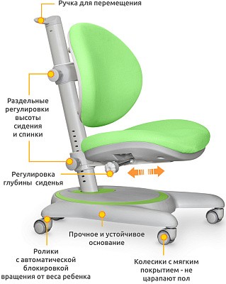 У кресла независимая регулировка высоты спинки и сиденья. Регулировка осуществяется с помощью специальных винтов на металлической несущей трубе Глубина сиденья регулируется ручкой -фиксатором. Кресло подойдет для детей от 3х лет до взрослого возраста