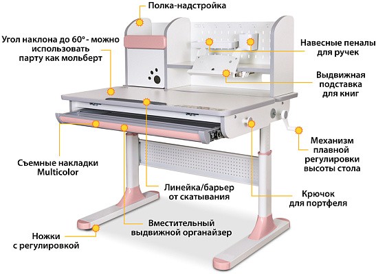 Наличие съемного прорезиненного барьера на столешнице предотвращает скатывание предметов во время выполнения домашнего задания.