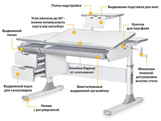 Наличие съемного прорезиненного барьера на столешнице предотвращает скатывание предметов во время выполнения домашнего задания.