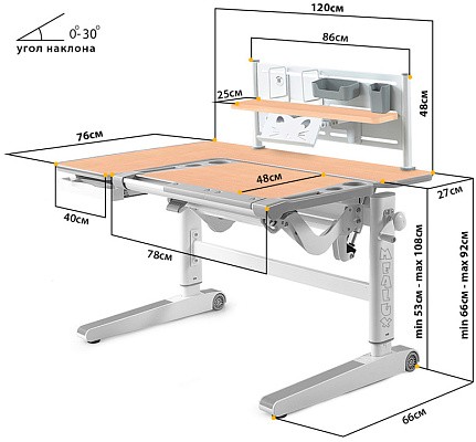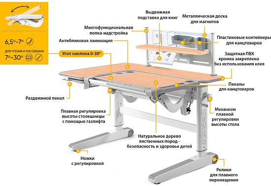 Угол наклона столешницы регулируется в диапазоне 0-30 градусов, плавность регулировки обеспечивается высококачественным механизмом газ-лифт.