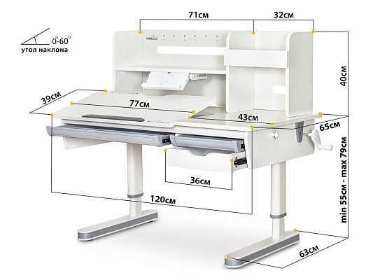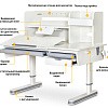 Рабочая часть столешницы меняет угол наклона до 60 градусов с помощью специального газлифта.. На столешнице есть зазор для безопасного процесса регулировки, с которым справится даже ребенок. Угол наклона меняется ступенчато и можно очень просто подобрать положение для чтения, письма, рисования.