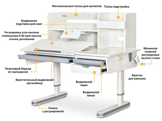 Огромным преимуществом этой модели является наличие многофункциональной полки-надстройки с выдвижной, регулируемой металлической подставкой для книги. Большое пространство и вместительность позволяют хранить множество учебников в полном порядке.
