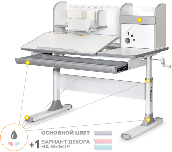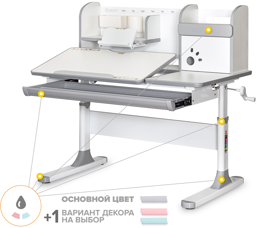 Важной особенностью данного стола является наличие сменных цветных накладок. Приобретайте полную комплектацию стола в сером цвете и получите розовые либо голубые накладки совершенно бесплатно! Накладки меняются на ножках, выдвижном органайзере и полке надстройке. Меняйте цвет в зависимости от настроения!