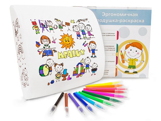 Ортопедическая подушка-раскраска EVO-Mealux поддерживает позвоночник в естественном положении, а также способствует формированию правильной осанки. Подушка фиксируется на спинке стульчика, беспрерывно поддерживает поясничный отдел спины ребенка, снижает нагрузку и минимизируя усталость во время длительного выполнения заданий. Одна из главных особенностей подушки - это съемный чехол-раскраска и набор текстильных фломастеров на водной основе.