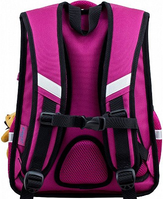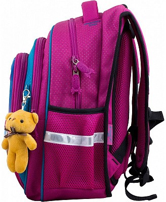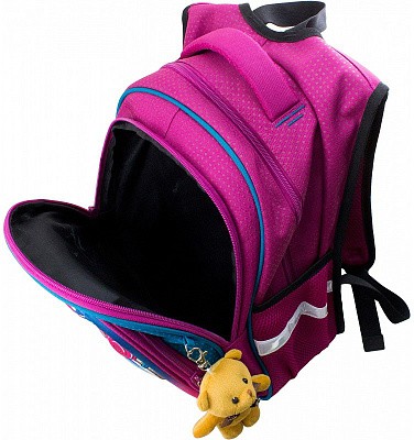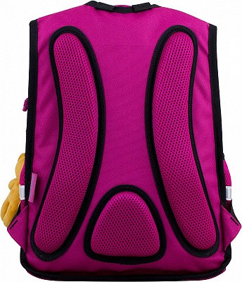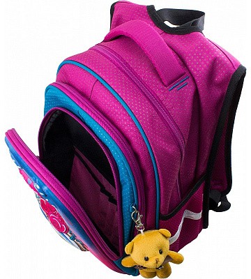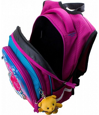В школьном рюкзаке два основных отделения и карман-органайзер. Основное отделение с 2 двумя разделителями и резинкой для крепления школьных принадлежностей. Второе отделение без наполнения. Спереди вместительный карман на молнии украшенный объёмной 3D картинкой с органайзером для письменных принадлежностей. По бокам карманы-сеточки на резинке.