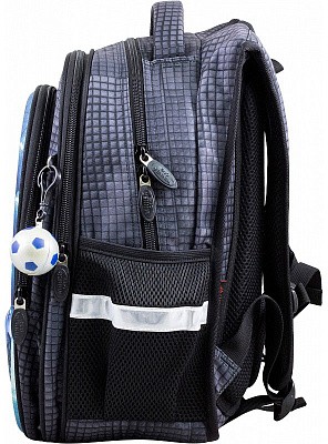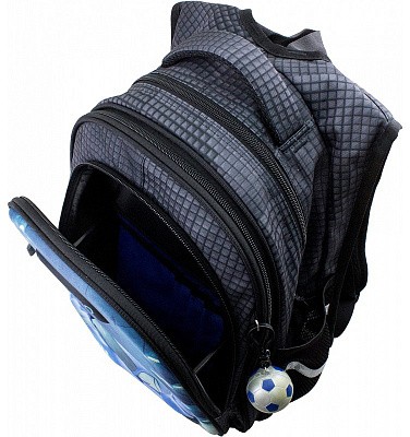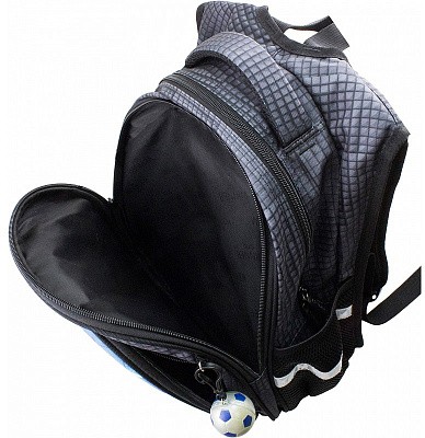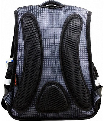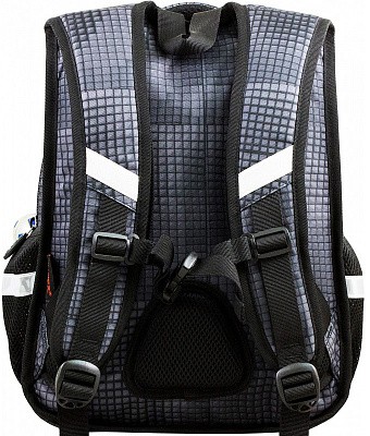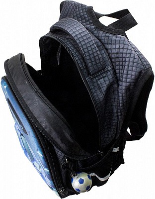 В школьном рюкзаке два основных отделения и карман-органайзер. Основное отделение с 2 двумя разделителями и резинкой для крепления школьных принадлежностей. Второе отделение без наполнения. Спереди вместительный карман на молнии украшенный объёмной 3D картинкой с органайзером для письменных принадлежностей. По бокам карманы-сеточки на резинке.