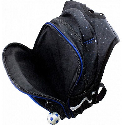 В школьном рюкзаке два основных отделения и карман-органайзер. Основное отделение с 2 двумя разделителями и резинкой для крепления школьных принадлежностей. Второе отделение без наполнения. Спереди вместительный карман на молнии украшенный объёмной 3D картинкой с органайзером для письменных принадлежностей. По бокам карманы-сеточки на резинке.