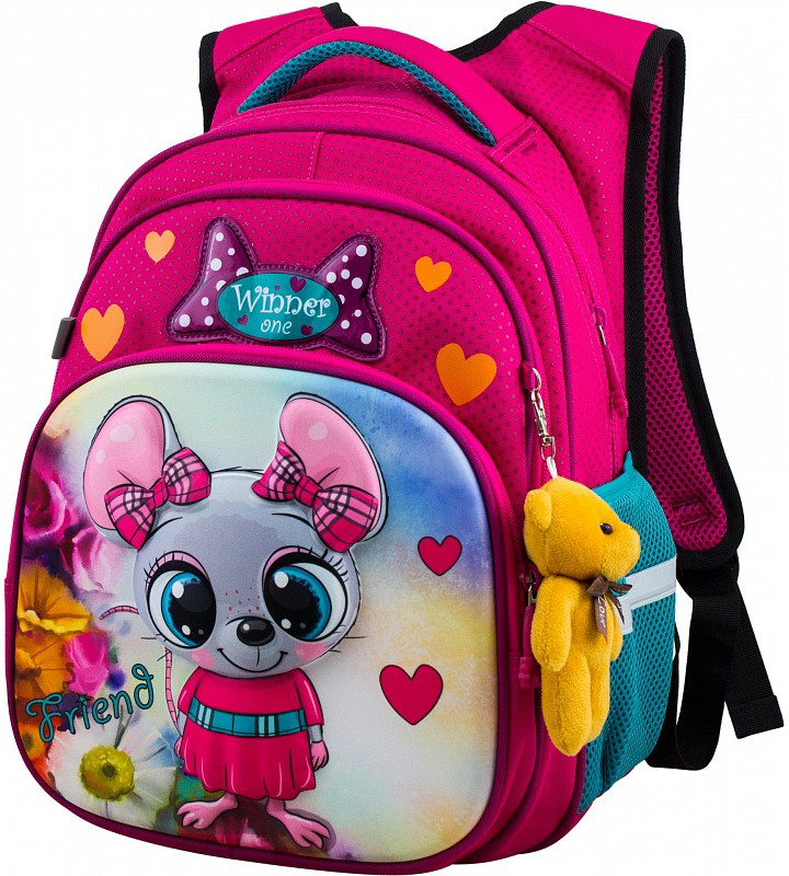 В школьном рюкзаке два основных отделения и карман-органайзер. Основное отделение с 2 двумя разделителями и резинкой для крепления школьных принадлежностей. Второе отделение без наполнения. Спереди вместительный карман на молнии украшенный объёмной 3D картинкой с органайзером для письменных принадлежностей. По бокам карманы-сеточки на резинке.
